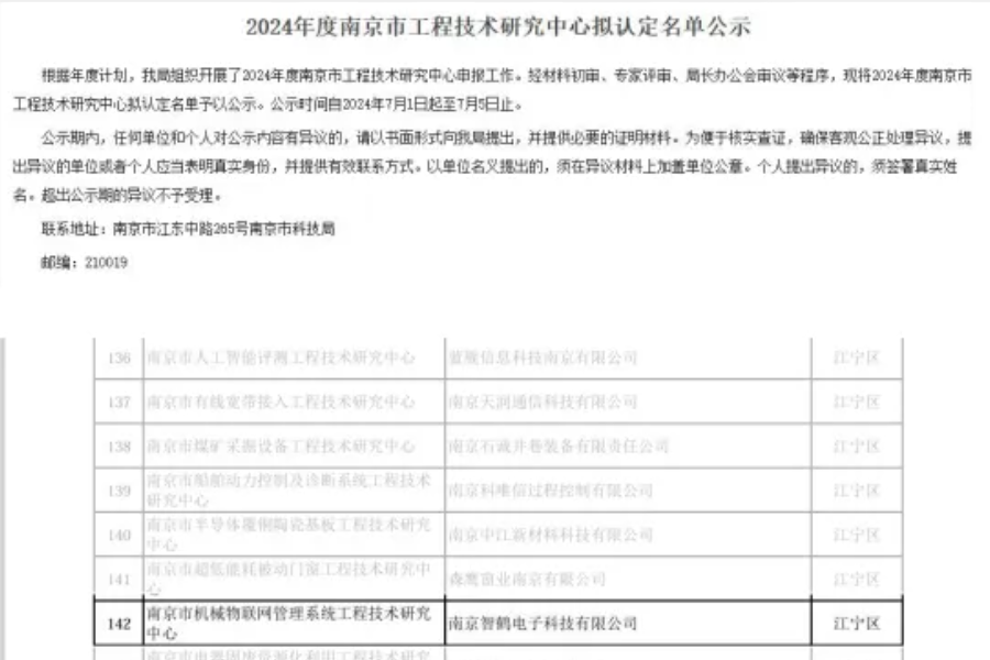 智鹤科技被南京市科学技术局拟认定为“南京市工程技术研究中心”